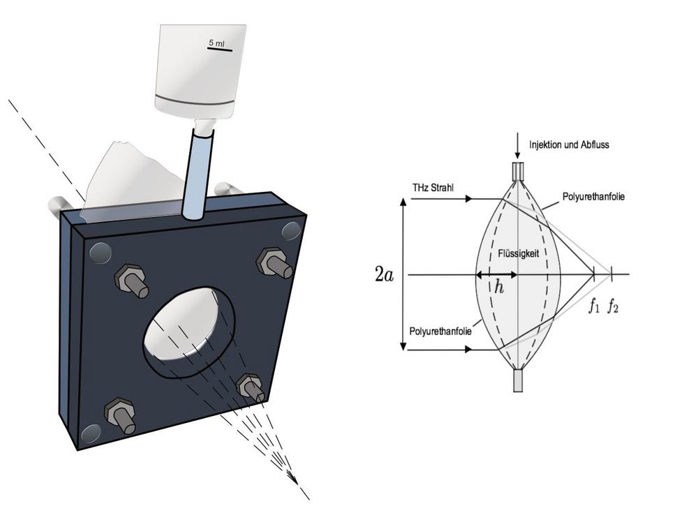 Am SKZ geht man deshalb zukünftig einen anderen Weg. Im Rahmen eines Forschungsprojekts zum Thema Objektrekonstruktion in der Mikrowellendefektoskopie wurde eine Linse mit einem variablen Fokus entwickelt. Das am SKZ entworfene Linsensystem besteht aus zwei Folien, die mit einer Flüssigkeit gefüllt werden. Durch Befüllen des Systems wird die Krümmung der Oberfläche vergrößert, wodurch die Brennweite f verkürzt werden kann. Wird die Flüssigkeit wieder entnommen, verlängert sich die Brennweite entsprechend reversibel. Die Forscher des SKZ simulierten verschiedene Kombinationen aus Flüssigkeiten und Folienmaterial und testeten diese empirisch. Es muss dabei ein möglichst elastisches Folienmaterial verwendet werden, um ein Faltenwerfen beim Entnehmen der Flüssigkeit zu vermeiden. An dieser Stelle entschied man sich für die Verwendung von einem Material, das auch bei speziellen Präservativen eingesetzt wird: Polyurethan. Weiterhin wurden verschiedene Flüssigkeiten getestet und die Eignung vergleichend bewertet. Dabei stellte sich heraus, dass insbesondere ein Öl, das normalerweise zur Pflege von Baby-Haut eingesetzt wird, optimale Strömungseigenschaften aufweist und eine ausgezeichnete Durchlässigkeit für elektromagnetische Wellen von Radarsystemen aufweist.