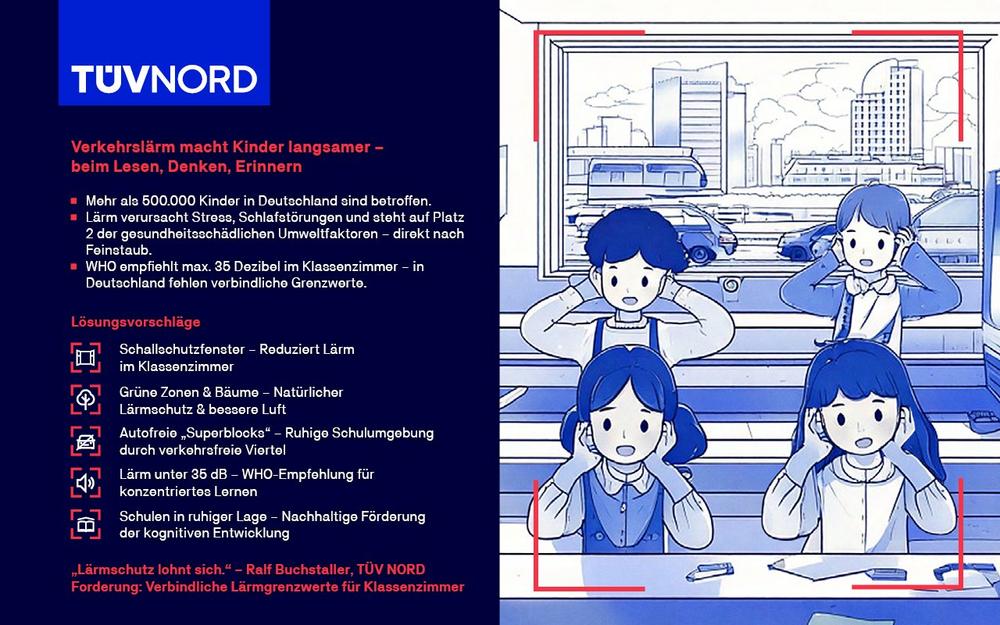 »Kinder brauchen eine ruhige Umgebung, damit sie sich gesund entwickeln können«, sagt Ralf Buchstaller vom Medizinisch-Psychologischen Institut des TÜV NORD in Hamburg. Wie der promovierte Psychologe erklärt, stört Dauerlärm nicht nur die Konzentration und damit das Lernen. Er könne auch Stress verursachen und der Gesundheit schaden. Unter anderem steigt das Risiko für Schlafstörungen, mit Folgen für den Körper und für die Psyche. Überdies bedeutet Verkehrslärm meist auch schlechte Luft, bedingt durch Abgase und Abrieb von Fahrzeugen. Unter den gesundheitsschädlichen Umweltfaktoren in Mitteleuropa steht Feinstaub auf Rang eins, Lärm auf Rang zwei.