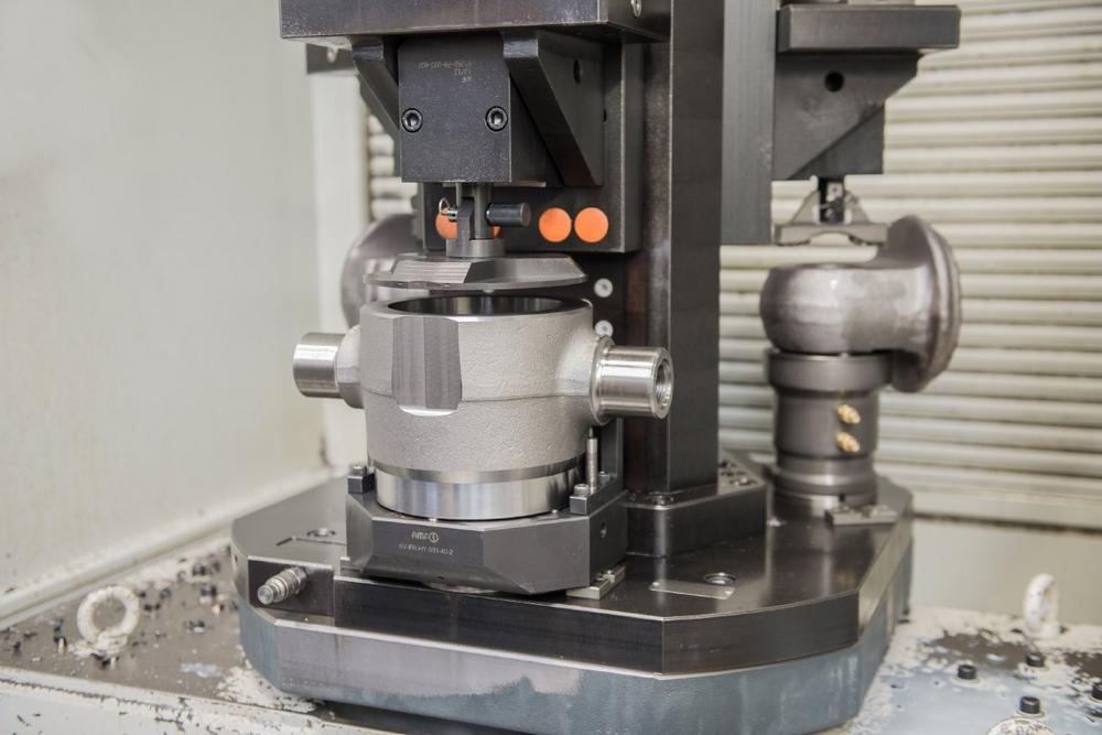 In einem früheren Konzept eines anderen Anbieters wurden zwei Bauteile pro Vorrichtung gespannt und bearbeitet. Dabei haben jedoch etliche Störkonturen die Bearbeitung eingeschränkt. „Unsere Vorrichtung spannt nur ein Rohteil. Das hat die Komplexität reduziert und die Prozesssicherheit deutlich erhöht.“ Nun kann das BAZ mit horizontaler Spindellage und Schwenktisch das Werkstück nach Messung der Lage für jede notwendige Bearbeitung toleranzgenau positionieren. Der Kunde lobte AMF als einen Partner der die Prozesse bestens versteht, auf ihn eingegangen sei und bei dem ein Ansprechpartner aus dem Projektteam immer direkt erreichbar war.